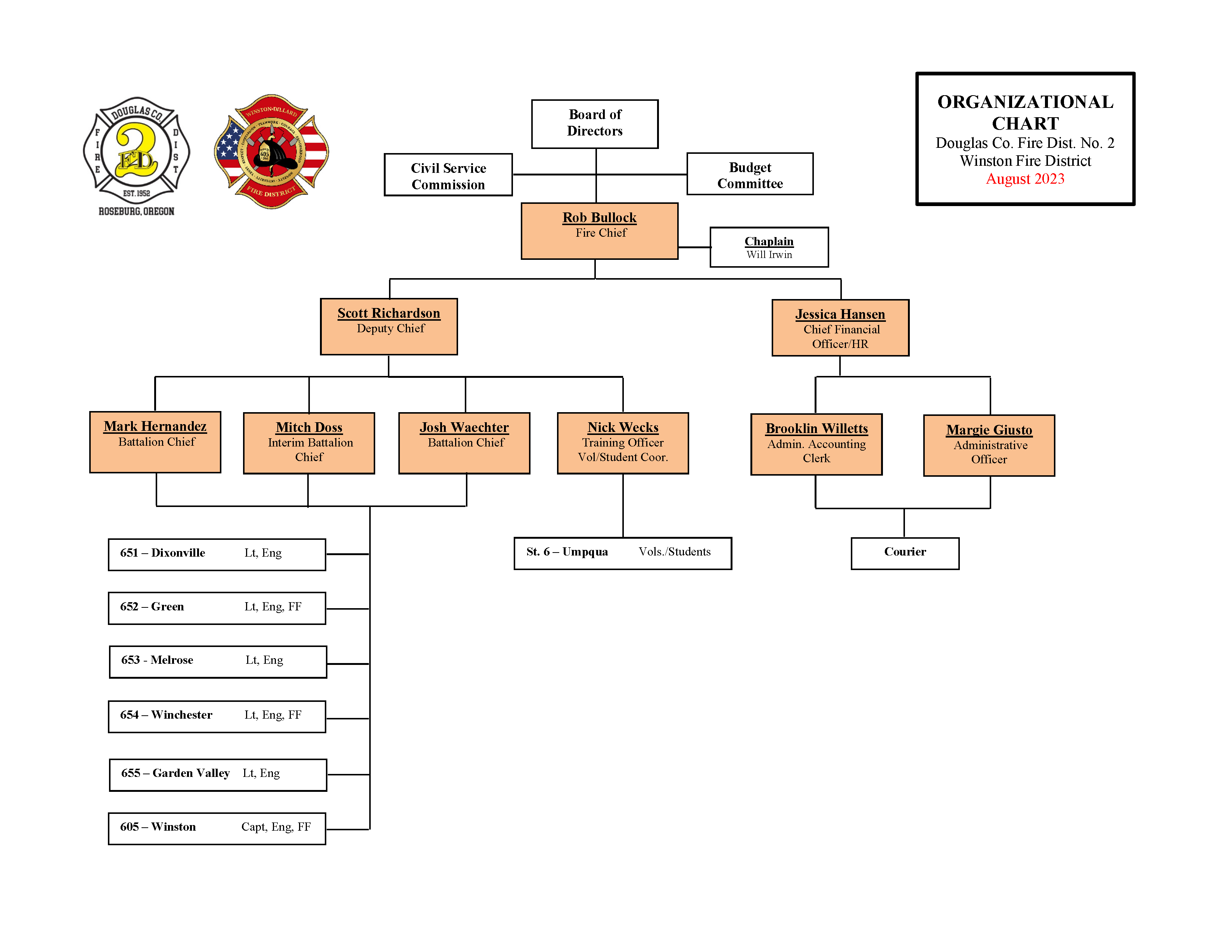 Chief Bullock joined Douglas County Fire District No.2 as a volunteer firefighter in 1986 and served in that capacity until he was hired by the district as a career firefighter/EMT in 1989. During his time with the District Chief Bullock has worked up through the ranks of firefighter, engineer, lieutenant, captain, deputy chief and his current position as Chief. While employed with the District Chief Bullock has continued his education receiving his paramedic certificate through Umpqua Community College, completing his Associates degree in fire science through Umpqua Community College, and has obtained his Bachelors degree in Public Service Administration through Grand Canyon University. Additionally he has completed several of the Fire Service Institute courses offered through Western and Eastern Oregon Universities.